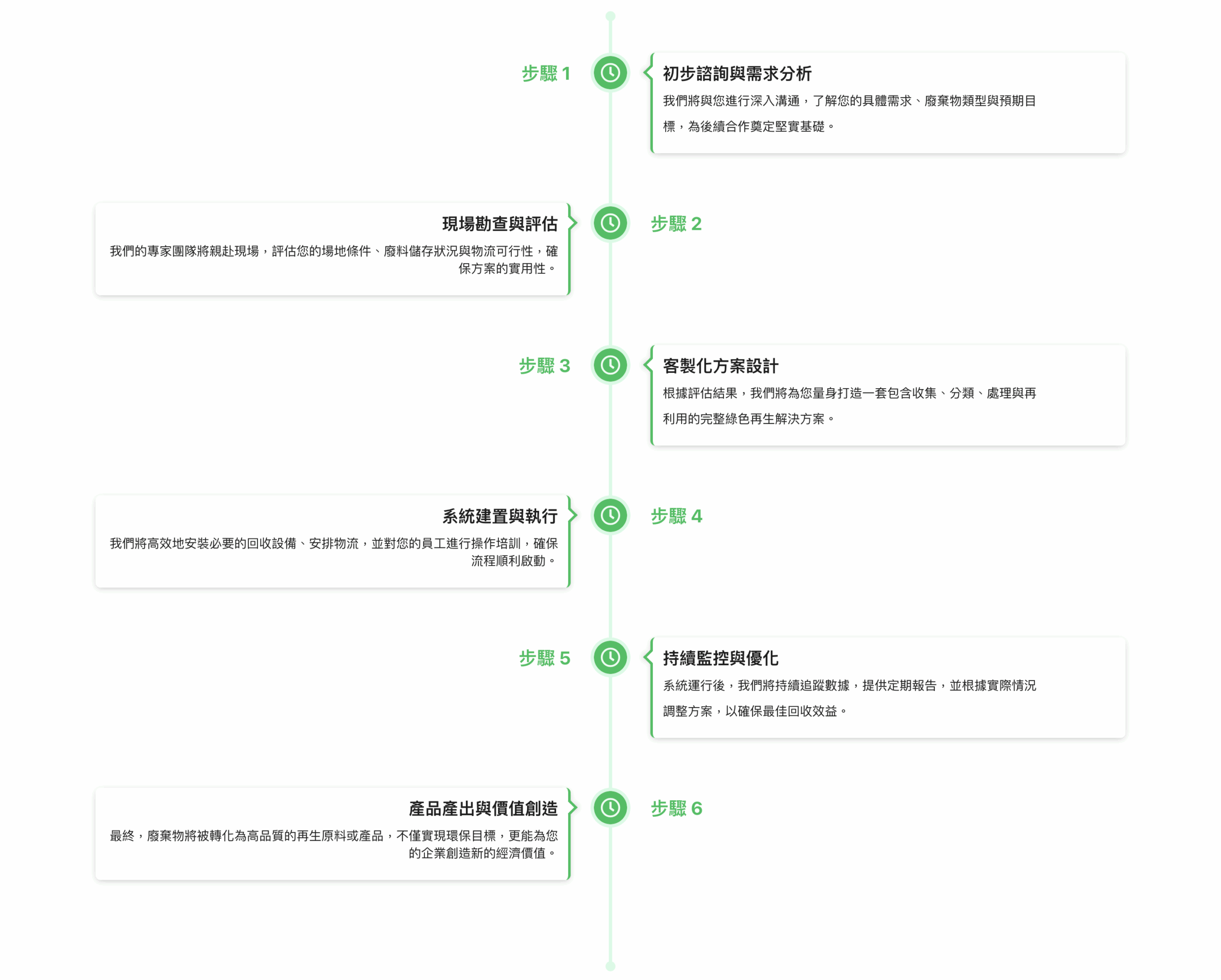 從初步諮詢到最終產品產出,我們確保提供一個無縫、高效且專為永續成功設計的完整流程。